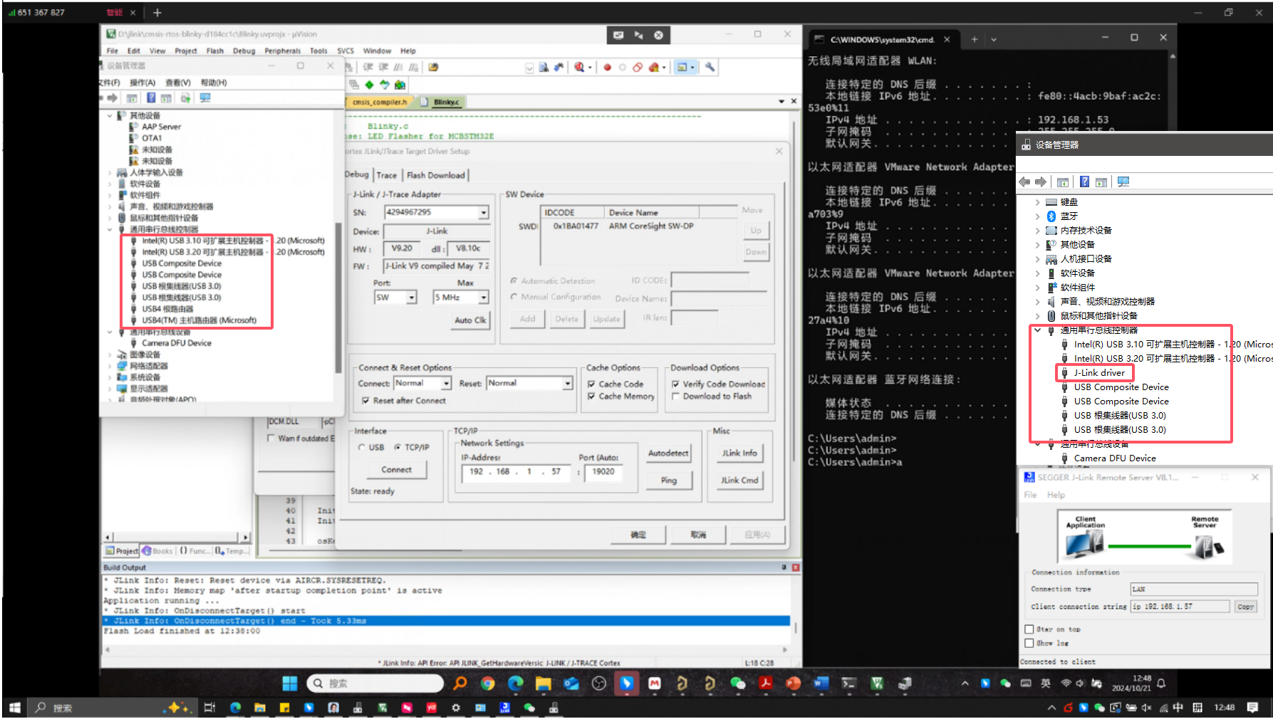那有沒有在公司或者在家就可以遠程在線調試的方法?今天,就給大家介紹一下這種方法:通過jlink遠程下載和調試工程代碼。實現如圖1所示,向日葵中的keil通過TCP/IP的鏈接方式,成功鏈接到另外一臺和設備直連的客戶機上。