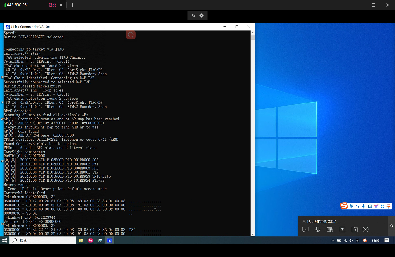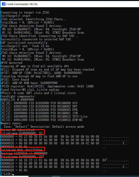 mem 0x08000000, 32 再次查看,可以看到,前4個字節的值,已經改變為我們設置的值。