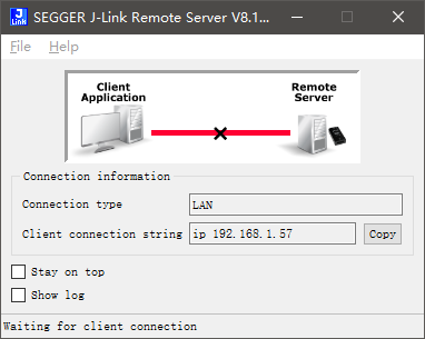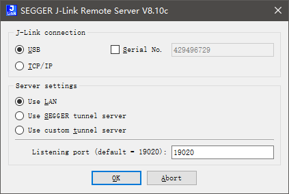1)、為現場已連接好設備和 Jlink 的電腦,安裝jlink驅動,并在其安裝目錄中找到并打開:J-Link Remote Server.exe,如圖2所示,勾選USB,并配置為使用局域網,點擊ok。