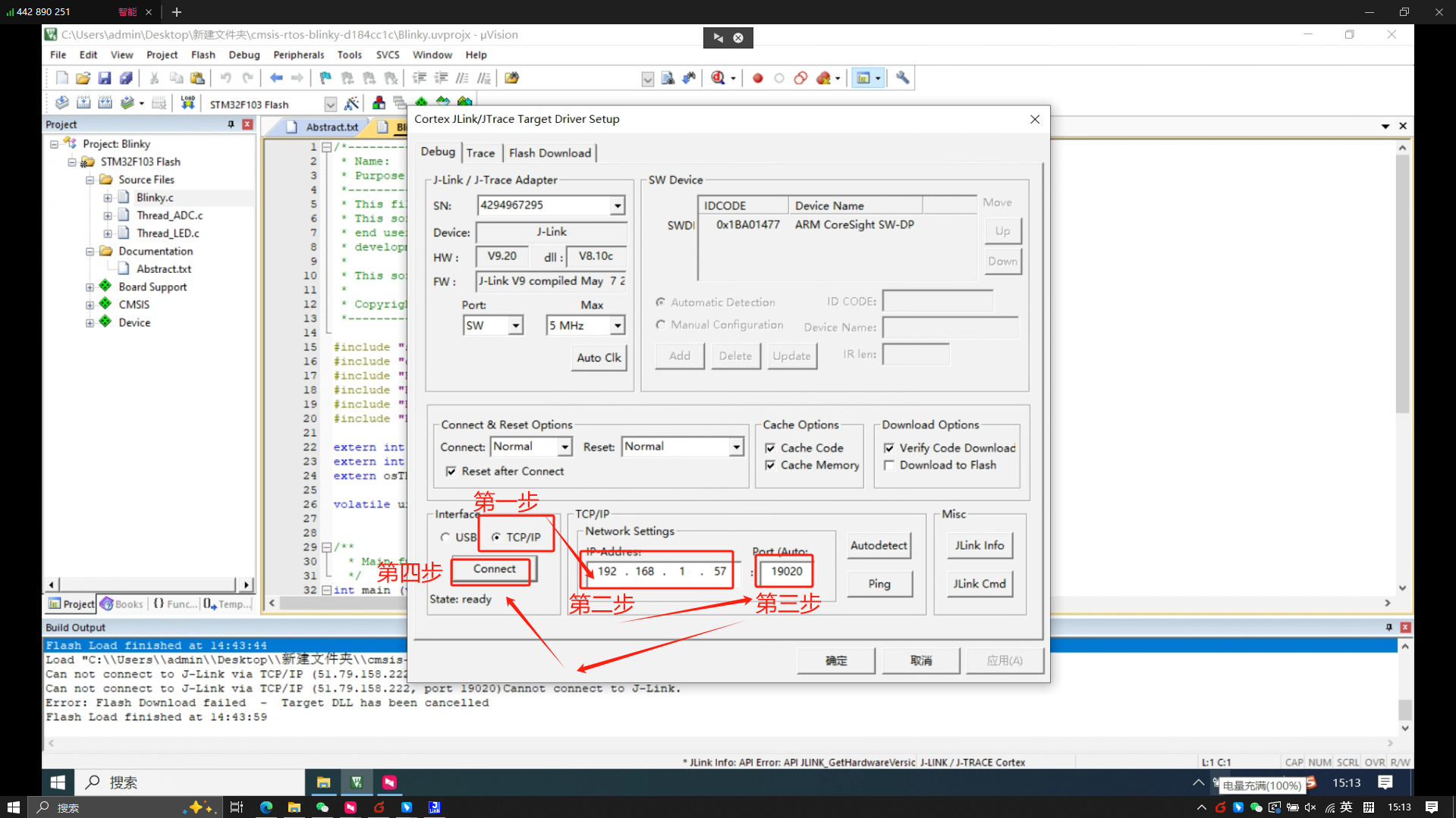 3)、打開客戶端的keil的debug界面,找到jlink的settings,如圖4所示。(這里我自己的電腦連接了電路板,連接了Jlink,是作為服務端的。圖4中正在被向日葵遠程的電腦,只安裝了keil mdk和Jlink驅動,和外界沒有任何物理線路的連接,是作為客戶端的)。在圖4中,勾選連接方式為TCP/IP,并輸入服務端IP地址和默認的端口號19020,點擊鏈接,即可以看到上方,出現了調試器SN號等信息。
