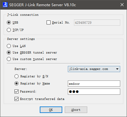 1)、為現場已連接好設備和 Jlink 的電腦,即服務端,安裝jlink驅動,并在其安裝目錄中找到并打開:J-Link Remote Server.exe,如圖6所示,勾選USB,并配置為使用segger的隧道服務器,使用的服務器為:jlink-asia.segger.com,通過自定義的名字識別,這里命名為emdoor,點擊ok。