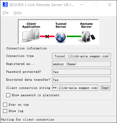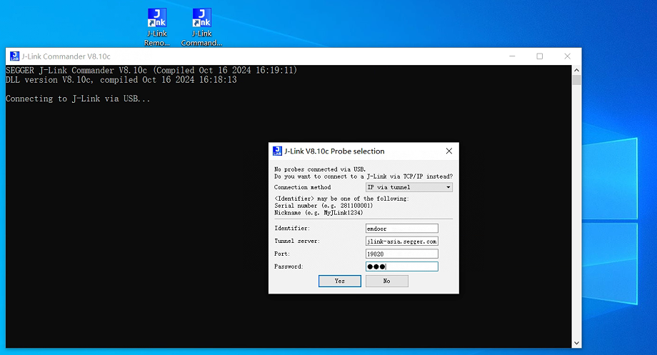 2)、在服務端的安裝目錄中,找到并打開:J-Link Commander.exe,如圖8所示,選擇連接方式為IP via tunnel,下面的Identifier為剛才我們命名:emdoor,隧道服務器為我們剛才選的:jlink-asia.segger.com,端口為默認的19020,密碼按照定義好的輸入后,點擊yes。