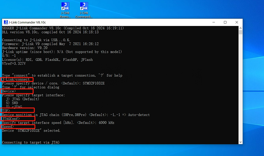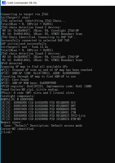 接著我們輸入connect,和目標板建立連接,接著他讓我們選擇板子的類型,由于我已經使用過,所以這里默認就是我需要的板子類型,直接回車確認了,再往后,是調試接口,我這里也是直接回車確認,默認為JTAG,后面也是,默認自動檢測,最后是默認4000kHz的目標接口速度。