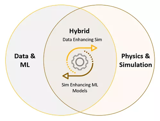 混合數字孿生是將物理和數據結合在一起的數字孿生體。換句話說,混合數字孿生不單獨依靠仿真或者機器學習(ML),而是同時發揮兩種方法的優勢,充分利用有關系統的所有可用知識。工程為創建物理模型提供信息,而數據則向該模型提供新洞察。將物理與數據相結合的方法和工具,構成了被稱為“混合分析”的工具集。