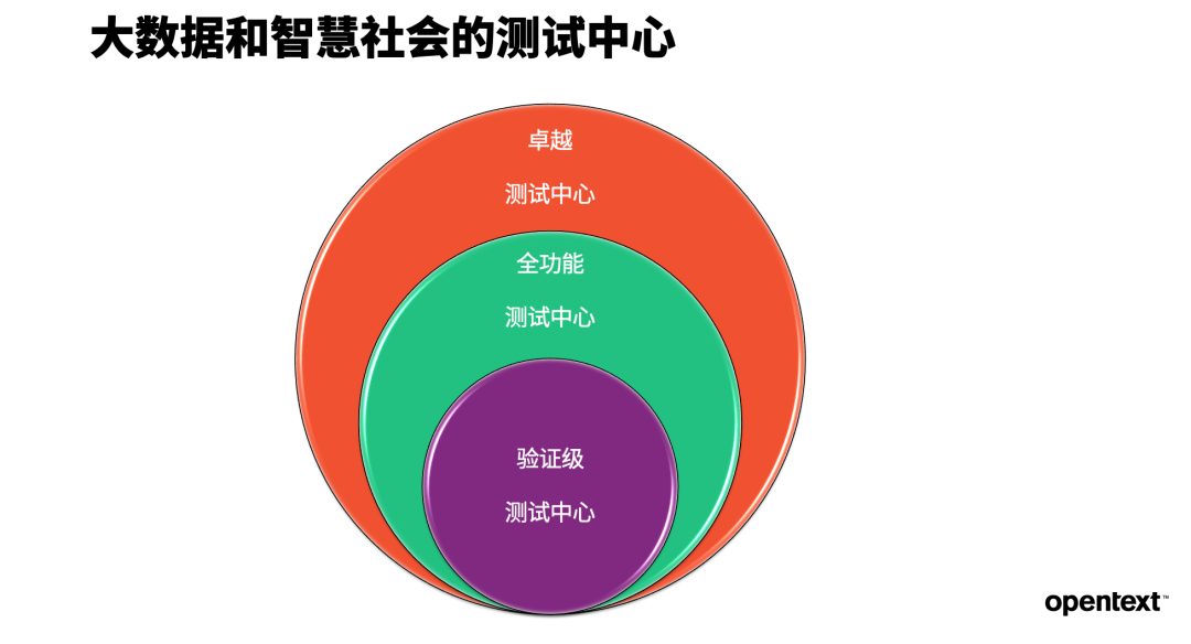 軟件質量管理,本質上離不開質量測試這一長久的命題。劉宏偉向在場嘉賓介紹了?OpenText 一整套經過長期驗證的測試中心架構體系。其以驗證級測試中心為核心,向外延展為全功能測試中心及卓越測試中心。而企業組織所需要的,就是最外沿的卓越測試中心。