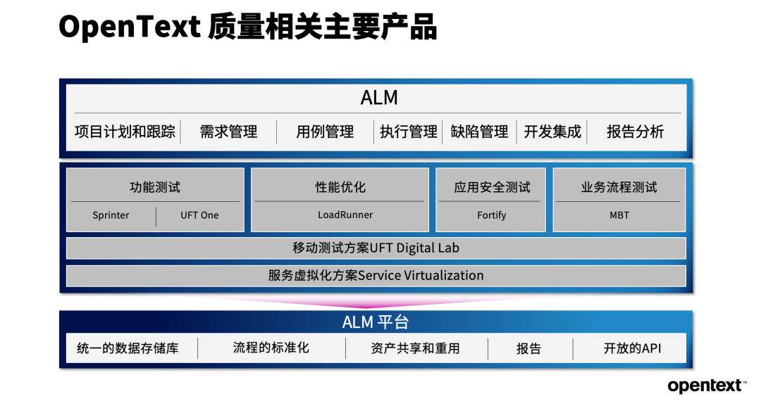 享譽測試業界已久的ALM、UFT系列產品及解決方案,正是 OpenText 軟件質量管理的“王牌產品”。其尤以 UFT One 功能測試、LoadRunner 性能優化、Fortify 應用安全測試、MBT 業務流程測試等四大工具為關鍵手段,包括提供 UFT Digital Lab 移動測試及 Service Virtualization 服務虛擬化等打包方案,并最終統一集成于強大的 ALM 應用平臺。
