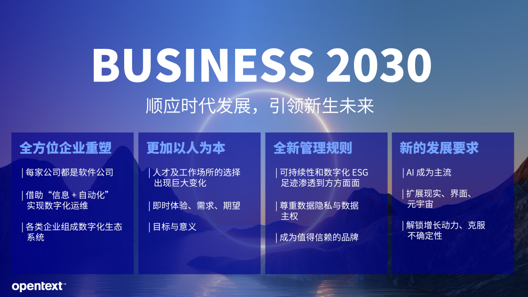 陳總在發(fā)言中表示,Micro Focus(現(xiàn) OpenText)的產品、解決方案及成功案例已廣泛具備全球領先水準。而其推出面向未來的「Business 2030」藍圖,旨從“全方位重塑企業(yè)”、“更加以人為本”、“煥新管理規(guī)則”、“更新發(fā)展要求”等四大方向出發(fā),融合“信息”、“自動化”兩大要素,開展多領域、全方位、高維度的整體變革。