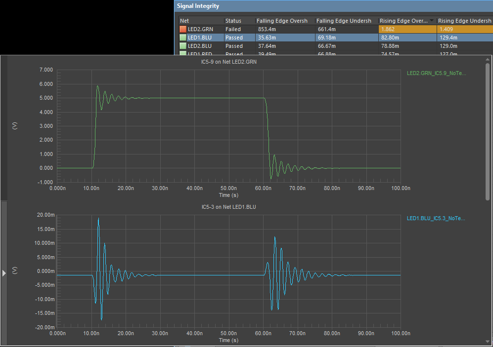 在設計階段,一些更先進的ECAD軟件包可以用于在一些簡單的仿真中識別信號完整性問題??梢砸黄饒绦械膬蓚€標準仿真是串擾波形計算和振鈴/反射波形。兩種仿真都需要為PCB布局布線中的驅動元件定義邏輯系列,您可以在數據表中找到。這些仿真非常清楚地顯示了互連之間的端接和間距的有效性,請參閱下文的互連瞬態響應。