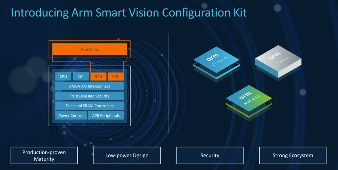 作為這樣產(chǎn)品形態(tài)的第一個(gè)范例便是 Arm 全新發(fā)布的智能視覺(jué)參考設(shè)計(jì),首次將 Arm IP 與安謀科技的 IP 結(jié)合在一起,并由安謀科技預(yù)先集成和預(yù)先驗(yàn)證。該方案的硬件參考設(shè)計(jì)包括 CPU、ISP、NPU 和 VPU 處理器選項(xiàng),以及將子系統(tǒng)粘合在一起的互連和系統(tǒng) IP。?該視覺(jué)參考設(shè)計(jì)通過(guò) Arm SystemReady 認(rèn)證和 PSA 安全認(rèn)證,保證對(duì)主流操作系統(tǒng)的支持和平臺(tái)安全性。而其 Arm 虛擬硬件可為生態(tài)伙伴提供虛擬模型,實(shí)現(xiàn)軟硬件協(xié)同設(shè)計(jì),進(jìn)一步縮短系統(tǒng)設(shè)計(jì)周期。