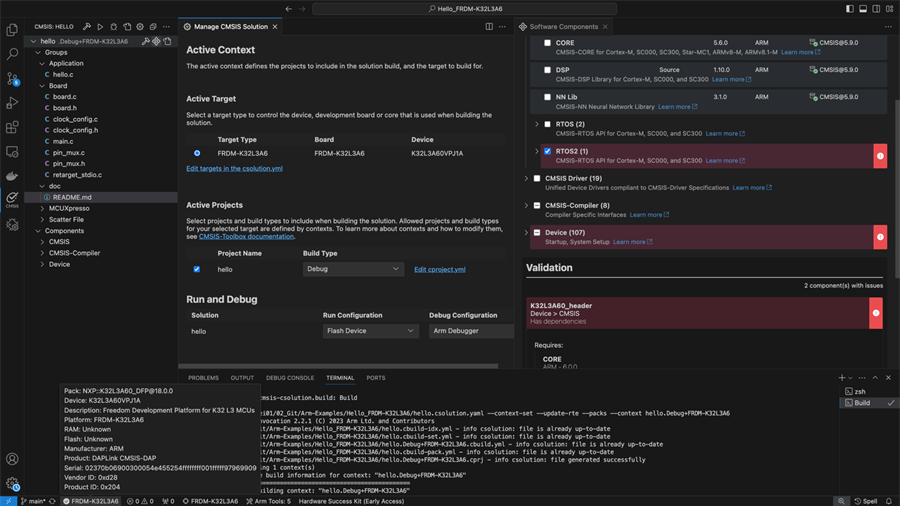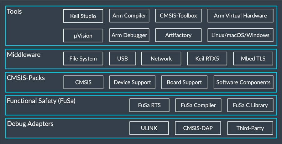 CMSIS-Toolbox實現(xiàn)了基于CMSIS-Pack的開發(fā)流程,是Keil MDK Version 6的關(guān)鍵組成部分。它在Keil Studio中可用,但也在μVision IDE中可用,后者已經(jīng)是嵌入式開發(fā)的事實標(biāo)準(zhǔn)多年了。CMSIS-Pack框架支持可以使用多個工具鏈(例如Arm Compiler 6、GCC和LLVM)的項目。包系統(tǒng)提供了來自許多供應(yīng)商的可重用軟件組件,包括各種RTOS內(nèi)核、設(shè)備驅(qū)動程序和中間件。