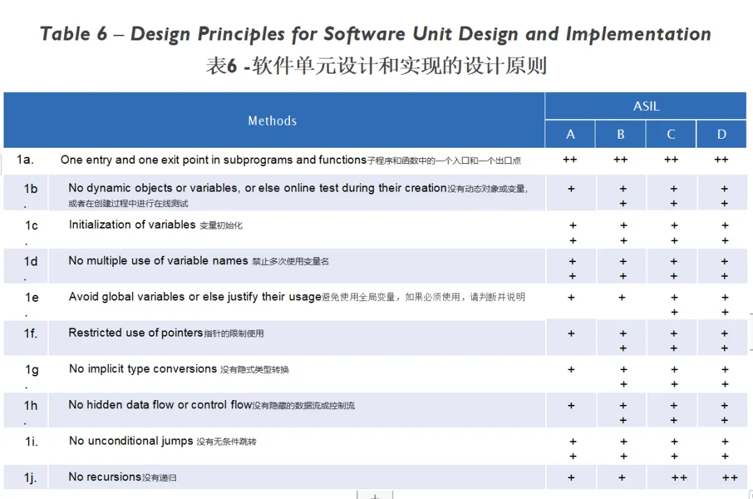 例如,在下面的表6中(第7頁),子程序和函數(shù)中的一個入口點(diǎn)和一個出口點(diǎn)被強(qiáng)烈推薦給所有的ASIL等級,而沒有遞歸只被推薦給較低的級別。