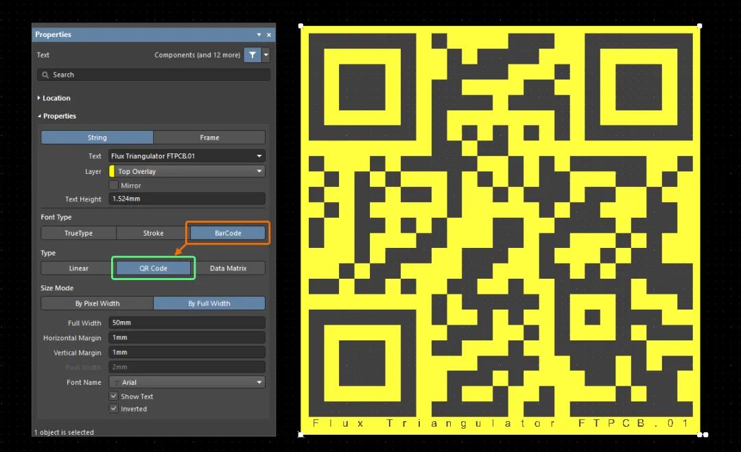 現(xiàn)在可以生成 QR 和 Data Matrix 代碼并將其放置在 PCB 設(shè)計(jì)中。為此,在選擇文本對(duì)象時(shí),在“屬性”面板的“字體類型”區(qū)域中選擇“條形碼”,然后在“類型”區(qū)域中選擇“QR 碼”或“Data Matrix”。