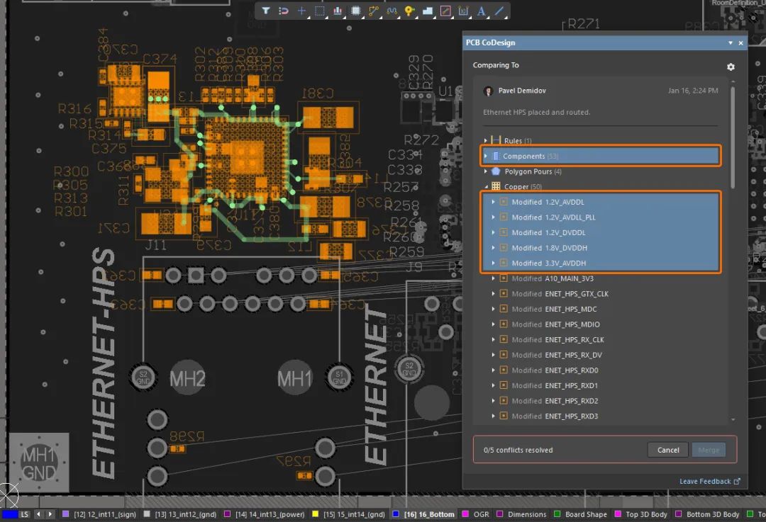為了在使用 PCB 協(xié)同設(shè)計(jì)功能時(shí)更高效地查看更改,現(xiàn)在不僅可以在 PCB 協(xié)同設(shè)計(jì)面板中選擇單個(gè)修改和沖突條目,還可以選擇同一類別或不同類別中的多個(gè)條目。使用 Shift+單擊 和/或 Ctrl+單擊 技術(shù)選擇條目,并在 PCB 編輯器設(shè)計(jì)空間中突出顯示它們。