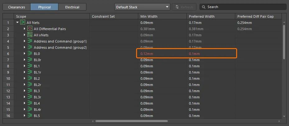 現(xiàn)在,在約束管理器的“物理”視圖的頂部網(wǎng)格中驗(yàn)證網(wǎng)絡(luò)和網(wǎng)絡(luò)類的寬度約束,如果發(fā)現(xiàn)值無(wú)效(例如,如果約束的最小寬度大于首選寬度),則使用紅色文本突出顯示。
