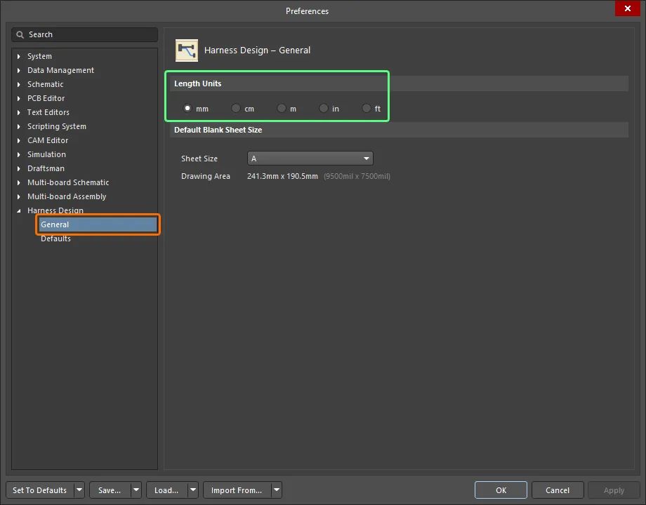 使用首選項(xiàng)對(duì)話框的新“線束設(shè)計(jì) – 常規(guī)”頁(yè)面指定新創(chuàng)建的接線圖和布局圖文檔的默認(rèn)長(zhǎng)度單位。