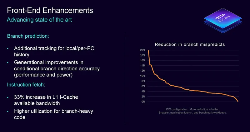 在前端設(shè)計(jì)上,C1-Ultra和上一代X925的核心參數(shù)decoder寬度,ALU數(shù)量,F(xiàn)PU數(shù)量等基本相同。C1-Ultra主要優(yōu)化是提升分支預(yù)測(cè)性能,增加記錄預(yù)測(cè)歷史的空間,從而提升分支預(yù)測(cè)的準(zhǔn)確性,對(duì)性能和功耗都有幫助。此外,一個(gè)明顯的變化是,L1指令緩存的帶寬提升了33,以實(shí)現(xiàn)更快的指令獲取速度。