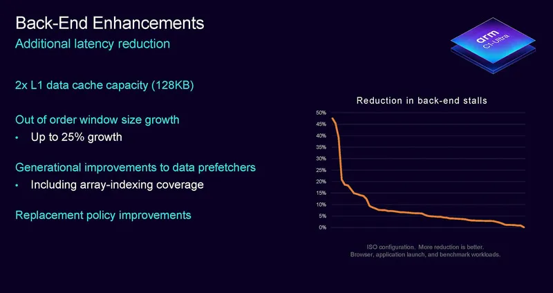 在后端設(shè)計(jì)上,C1-Ultra的L1數(shù)據(jù)緩存容量從64KB提升到128KB,這個(gè)大小要超出高通Oryon的96KB,可惜L1指令緩存還是大小還是64KB,不如Oryon的192KB。這也是多年來(lái)Arm第一次在旗艦核心上增加L1緩存的容量。