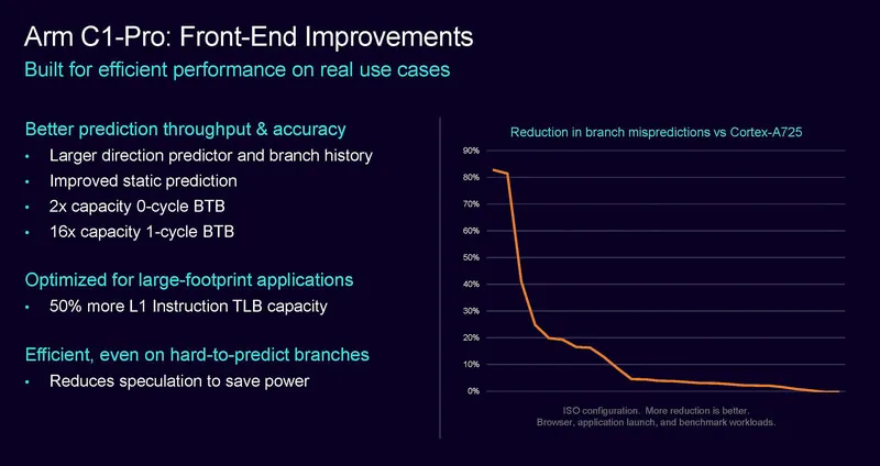 C1-Pro在前端設(shè)計(jì)上重點(diǎn)優(yōu)化了分支預(yù)測(cè)的吞吐率和準(zhǔn)確性,L1指令的TLB容量提升了50,并且降低了分支預(yù)期的功耗。