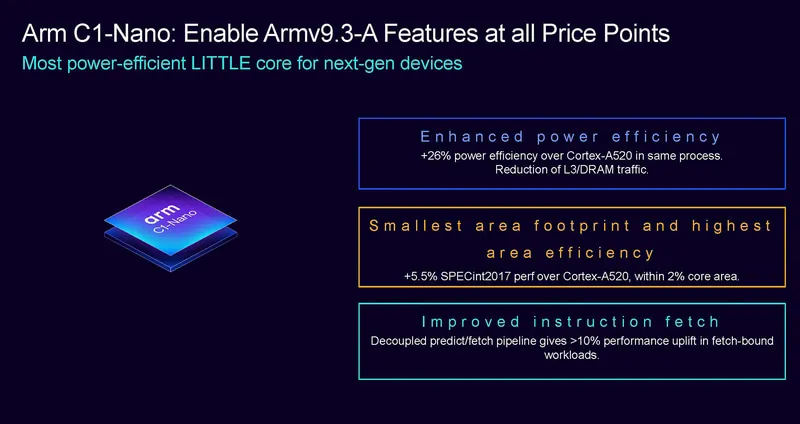 下面我們來(lái)看一下C1-Nano核心,這也是一顆Armv9.3-A架構(gòu)的處理器。Arm宣稱C1-Nano相比A520提升了26的效能,并有效減少L3到內(nèi)存的擁塞。性能上,在不到2的核心面積增加下(小核心很在意核心面積),性能可以提升5.5。還通過(guò)解耦預(yù)測(cè)和取指流水線,提升了指令預(yù)取的性能。