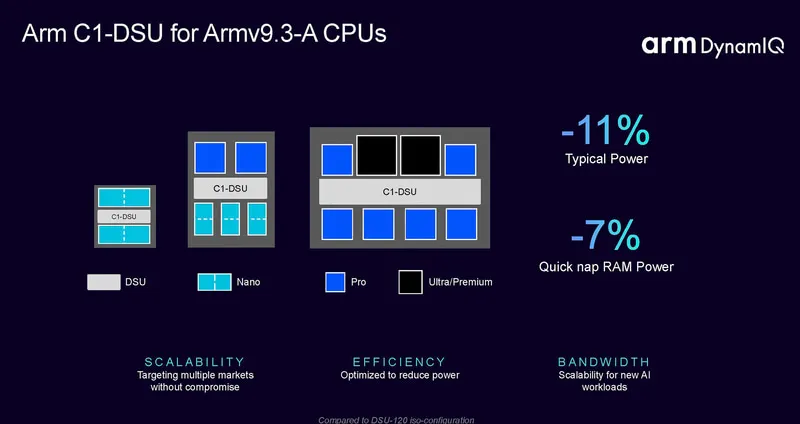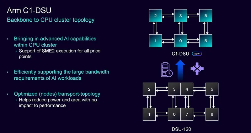 新一代的C1-DSU相比DS120,調(diào)整了CPU連接的拓?fù)浣Y(jié)構(gòu),提供優(yōu)秀的AI能力支持,支持新的SME2擴(kuò)展指令集,并且在不影響性能的情況下降低了功耗和面積。