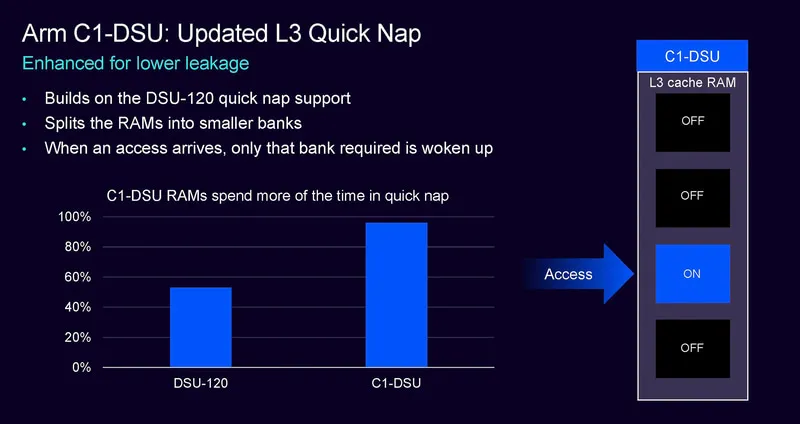 DSU是連接多個(gè)處理器核心的關(guān)鍵模塊,這一代的新DSU命名為C1-DSU。這一代的C1-DSU,Arm宣稱功耗可以節(jié)省11,Quick Nap內(nèi)存(L3支持的功能)功耗可以降低7。