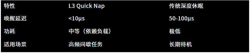 下面是一個(gè)L3 Quick Nap和傳統(tǒng)深度休眠的數(shù)據(jù)對(duì)比: