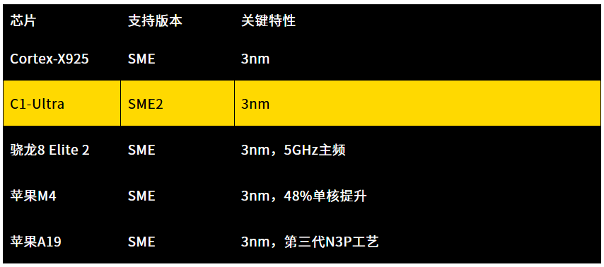 SME(Scalable Matrix Extension,可擴(kuò)展矩陣擴(kuò)展)是Armv9架構(gòu)引入的指令集,雖然SME指令集在2021年就提出了,但是Arm的Cortex-X系列處理器從X925才開(kāi)始支持第一代的SME指令集,蘋果公司的M4處理器和今年的A19處理器也支持第一代的SME指令集,最新的高通的8 Elite 2處理器也可以支持SME指令集。今年的Arm C1系列則全面升級(jí)到了SME2指令集。
