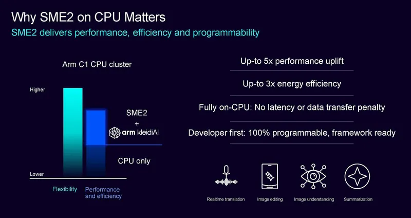 在性能表現(xiàn)上,Arm宣稱SME2對(duì)性能上有顯著幫助,例如在AI任務(wù)中,SME2可使CPU集群的AI性能提升5倍,同時(shí)實(shí)現(xiàn)了3倍的能效提升。由于AI類計(jì)算需要調(diào)用非常多的矩陣計(jì)算,因此SME2在AI類應(yīng)用中尤為有效。