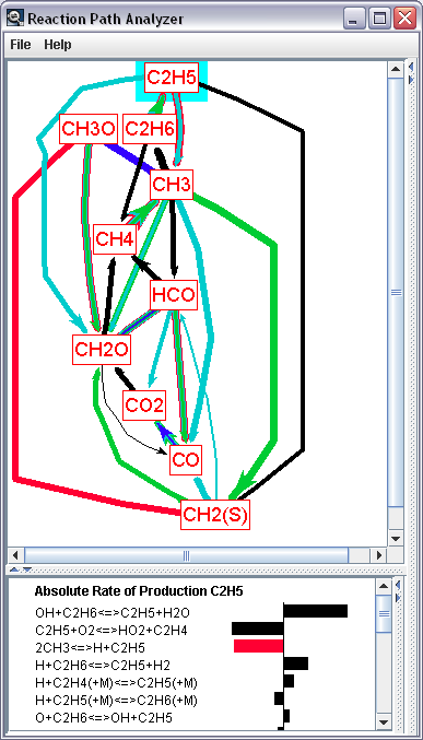 為了幫助您獲得關鍵動力學的關聯關系,CHEMKIN-PRO提供了反應路徑分析。反應途徑分析工具采用交互式、可視化的顯示界面,清晰顯示主導反應的路徑,從而為機理的開發和機理簡化提供了手段。