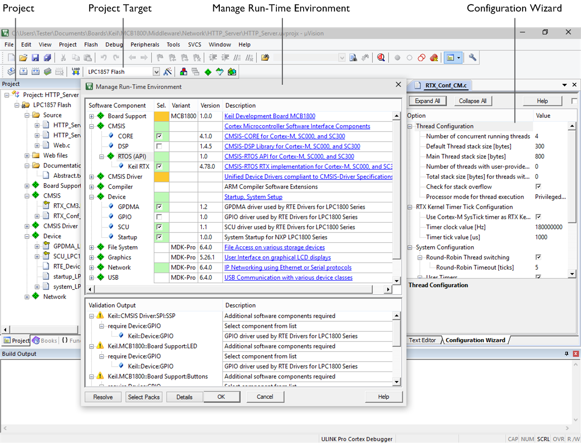 Keil MDK 開發套件包括 Windows 平臺的 IDE、 編輯器、 高性能的編譯器、 調試器、 軟件包管理器、 CMSIS 標準接口庫及中間件等。這一系列工具使得您的嵌入式軟件開發項目更加迅捷。