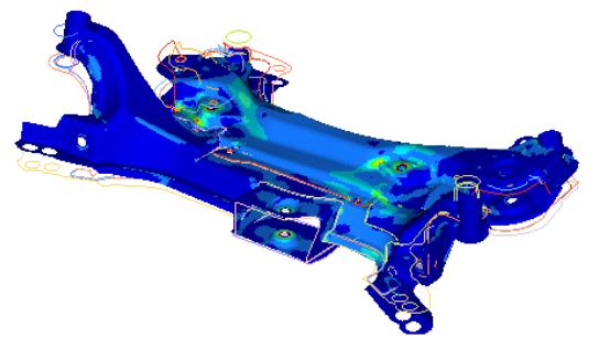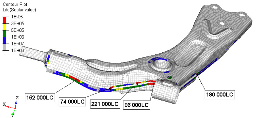 · 縫焊疲勞耐久分析 以轎車下控制臂為研究對象,通過使用軟件Ansys nCode designlife的焊縫疲勞分析功能,基于焊縫熱影響區(qū)域(HAZ)的焊趾和焊根單元應(yīng)力值用于疲勞壽命評估。