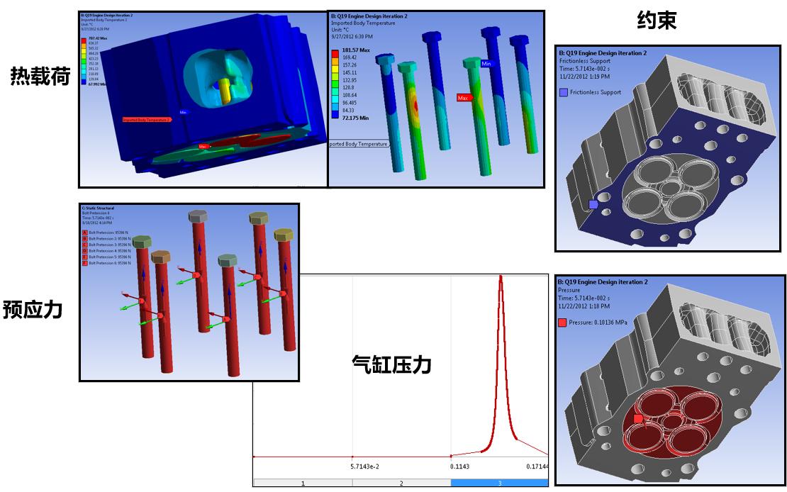 · 零件/連接件強(qiáng)度分析 以轎車發(fā)動(dòng)機(jī)缸蓋螺栓為研究對象,通過使用軟件Ansys mechanical static structural分析了其在不同工況下的應(yīng)力分布。