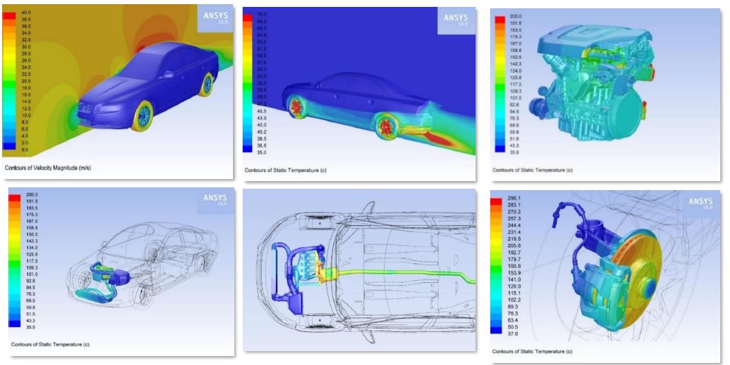 · 整車熱管理分析 以轎車造型和動(dòng)力總成為研究對象,通過使用軟件Ansys Fluent建立了發(fā)動(dòng)機(jī)熱管理系統(tǒng)模型,模擬出整車的溫度分布。
