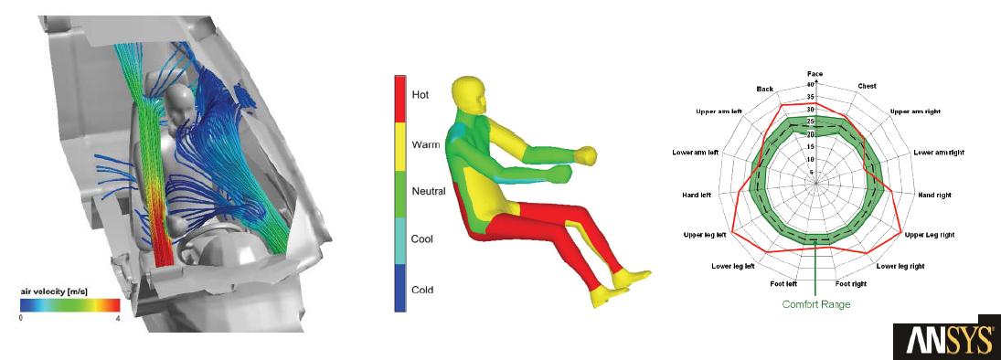 · 乘員艙舒適性 以轎車造型和內(nèi)飾為研究對象,通過使用軟件Ansys Fluent分析規(guī)定工況下的降溫采暖性能能否滿足要求,改善乘員艙的溫度分布。
