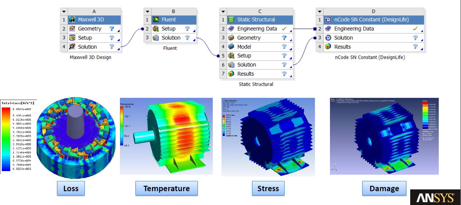 · 電機(jī)電磁-熱-結(jié)構(gòu)多學(xué)科仿真分析 本文以某電機(jī)為分析對象,通過使用 Ansys workbench平臺,綜合了基于Maxwell 3D電磁分析、fluent流體分析、Static structural熱變形分析和nCode desisgnlife疲勞耐久壽命的多物理場仿真。