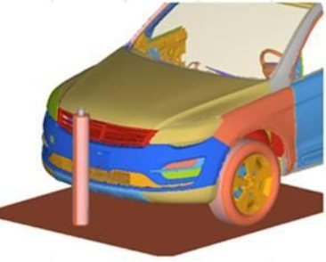 · 行人保護(hù)分析 以整車前半部分和行人下腿模型為研究對象,通過使用Ls_dyna軟件進(jìn)行行人保護(hù)仿真分析,根據(jù)行人下腿型撞擊結(jié)果,判斷對行人腿部造成的損傷程度。