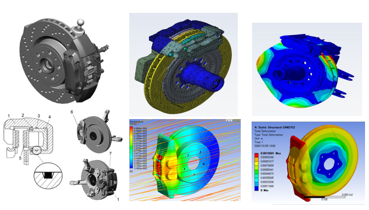 · 制動(dòng)系統(tǒng)分析 本文以某車型盤式制動(dòng)器為分析對象,通過使用 Ansys workbench平臺中建立了其限元模型,綜合考慮了盤式制動(dòng)器的模態(tài)振型,顯式制動(dòng)發(fā)熱,熱變形的耦合分析。