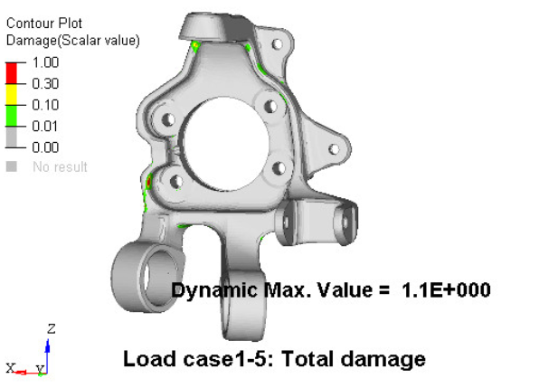 · 基于應(yīng)力疲勞耐久分析 以轎車轉(zhuǎn)向節(jié)為研究對象,通過使用軟件Ansys nCode designlife的應(yīng)力疲勞分析功能,分析了其在特定載荷下的損傷分布。