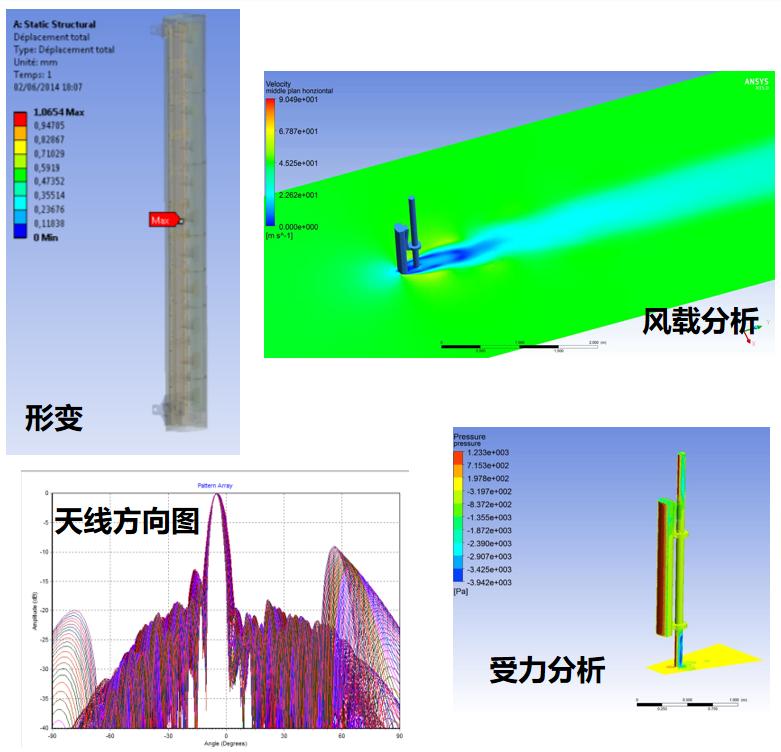 · 基站天線系統(tǒng)多物理場(chǎng)仿真 以基站天線為研究對(duì)象,使用軟件ANSYS HFSS,將經(jīng)過優(yōu)化的天線模型導(dǎo)入workbench平臺(tái),利用CFX分析天線周圍風(fēng)速、風(fēng)洞內(nèi)氣流行為、湍流檢測(cè)等,將風(fēng)壓導(dǎo)入Mechanical計(jì)算基站天線是否發(fā)生形變,從而獲得基站天線全方位的性能分析。