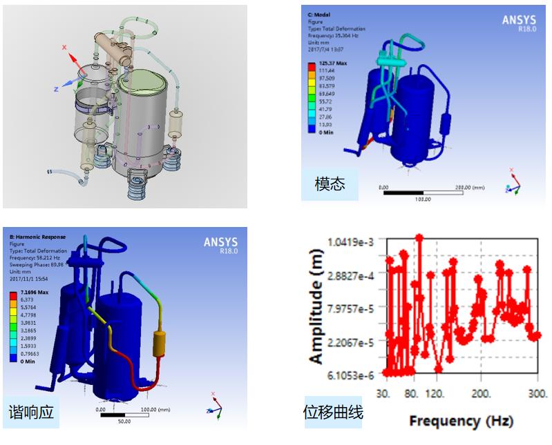 · 壓縮機配管系統模態及諧響應分析 以壓縮機配管系統為研究對象,研究壓縮機配管系統的固有頻率和振型,以及變頻工作過程中配管系統各彎角處的振幅、加速度和應力。