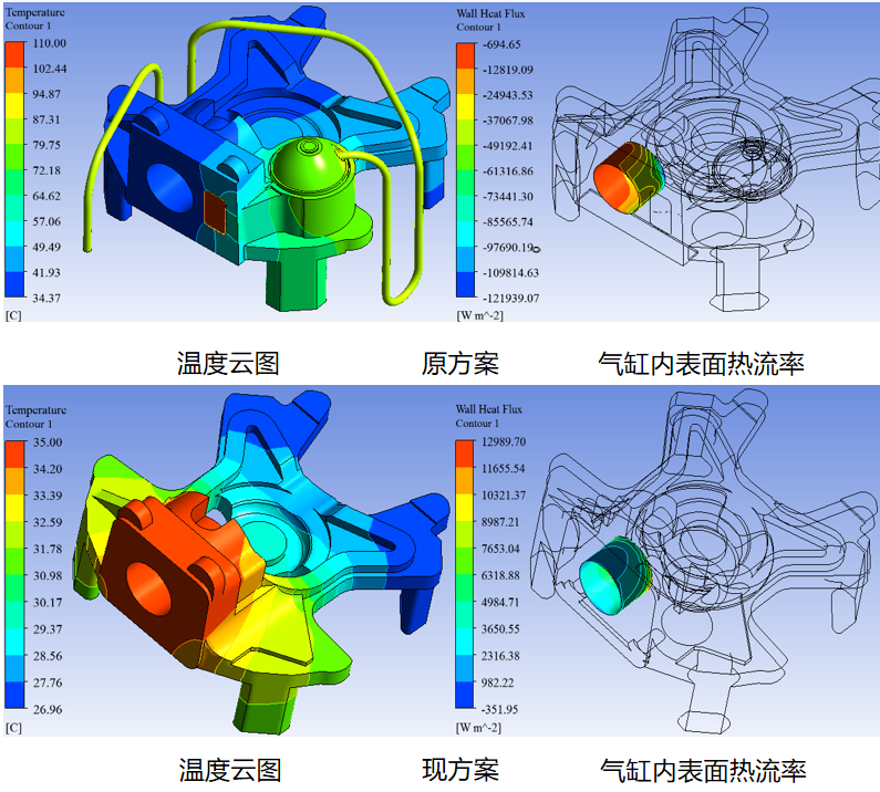 · 壓縮機排氣系統換熱計算 以壓縮機排氣系統為研究對象,使用軟件ANSYS Fluent,對比兩種工況的壓縮機排氣系統的傳熱結果(消音包與缸體是否為一體),如溫度分布云圖、表面熱流率等。