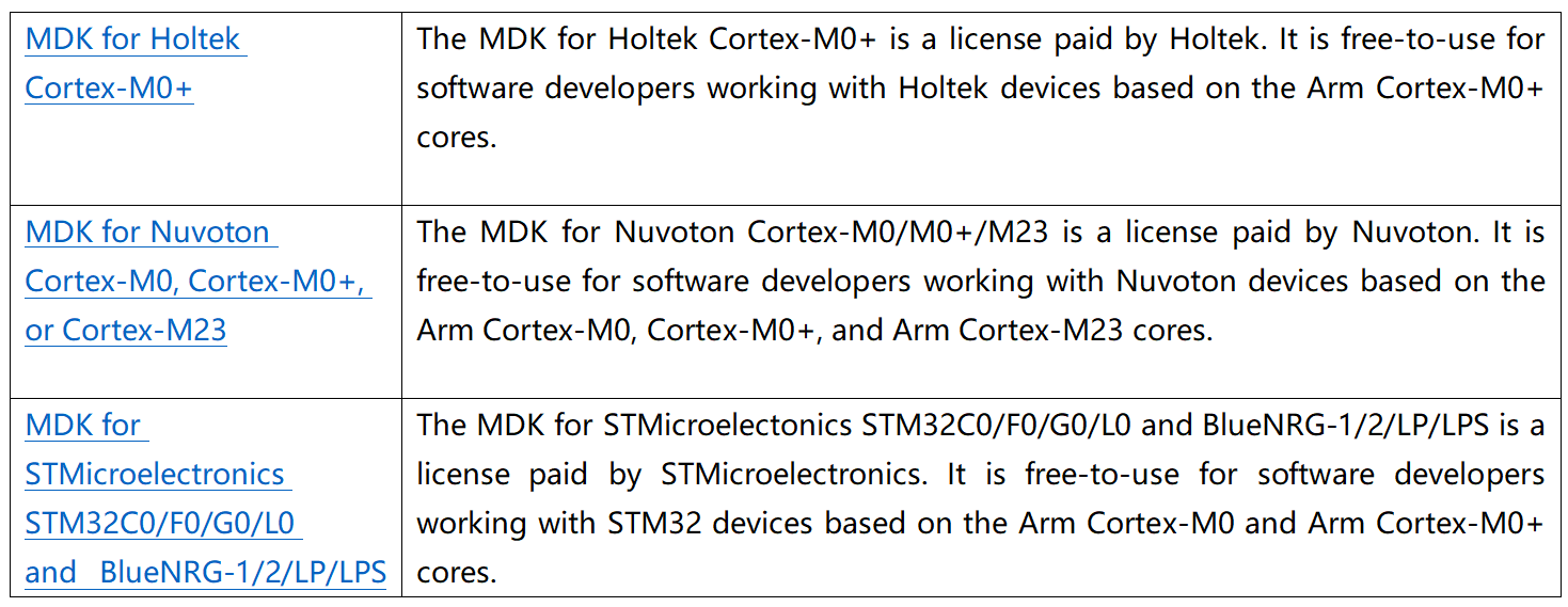 1 ?MDK 免費(fèi)授權(quán): 合泰、新唐、意法半導(dǎo)體的 M0 和 M0+架構(gòu)的芯片。