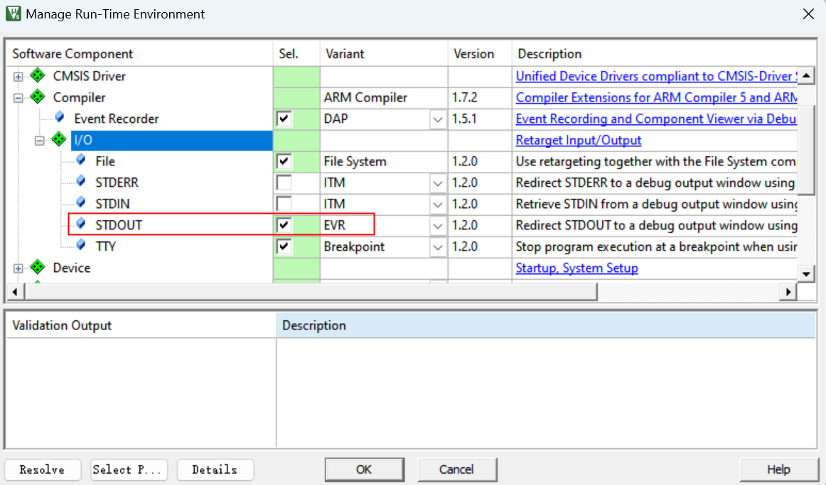 1)、打開工程的“Manager Run-Time Environment”窗體,選中“STDOUT”并把其設置為“EVR”(需調用EventRecorder),如圖4-2所示: