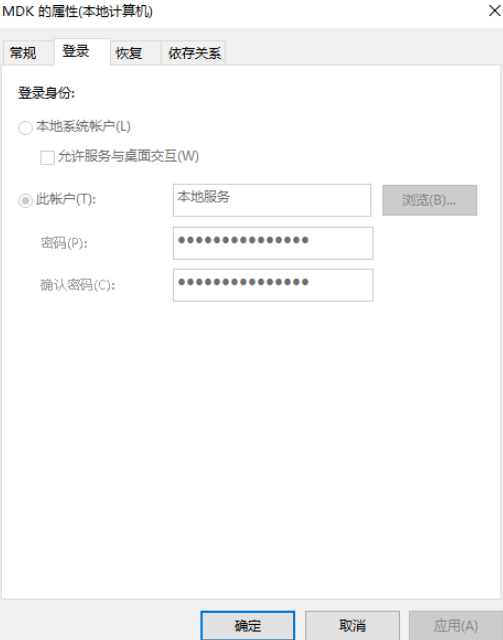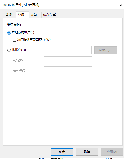 1)、由于操作者權限的原因,無法把MDK的服務修改為本地啟動,如圖4-1所示:
