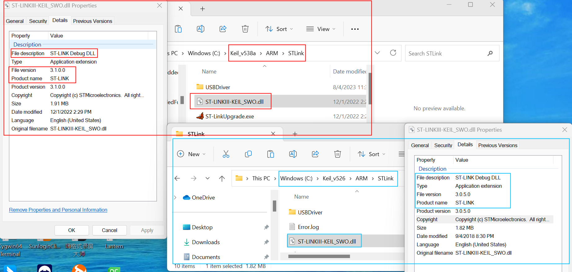 1)、打開Keil MDK5.38a與Keil MDK 5.26關(guān)于St-Link仿真器的目錄,查看“ ST-LINKIII-KEIL_SWO.dll ”的屬性,會發(fā)現(xiàn)這兩個不同目錄下的文件的版本不一樣,如圖4-1所示: