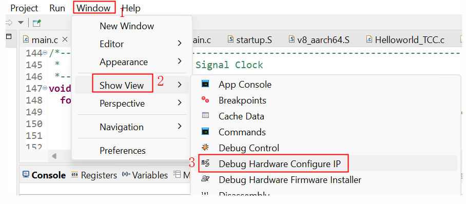 1)、打開ArmDS,選擇“window-->Show View-->Debug Hardware Configure IP”, 打開IP配置窗體,如圖4-1所示: