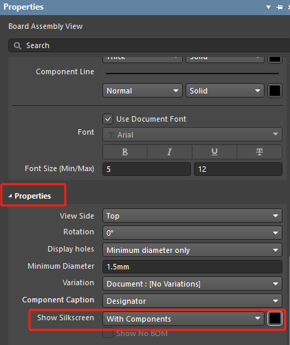 2、Drafsman 文檔中選中圖形在 Propertise 的 Show Silkscreen 選擇"With component"選項,并在后面的顏色框中設置顏色為黑色。