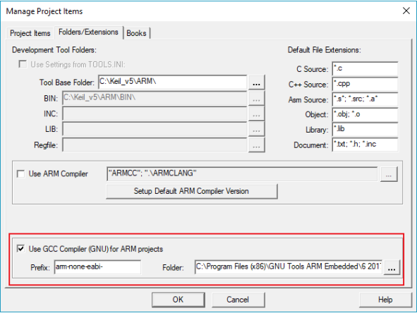 2、在KEIL中打開Manage Project Items。切換到Folders/Extensions欄,選擇勾選”Use GCC Compiler(GUN)for ARM project”,切換到使用GCC工具鏈。(如圖1)