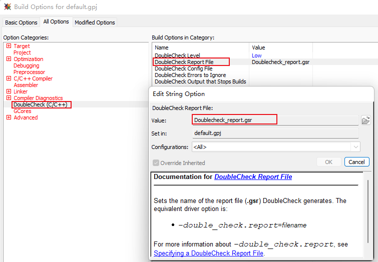 1)、DoubleCheck報告輸出需要通過Build Options中的DoubleCheck(CC++)->DoubleCheck Report File進(jìn)行設(shè)置,在value窗口中去指定報告的文件名,例如:DoubleCheck_report.gsr。 (如圖4-1)