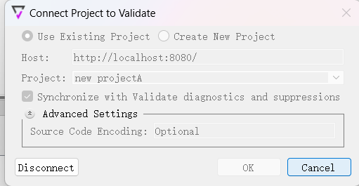 5、在彈出的Connect Project to Validate窗口選擇Use Existing Project,Project輸入項(xiàng)目名,勾選同步,點(diǎn)擊“Connect”;